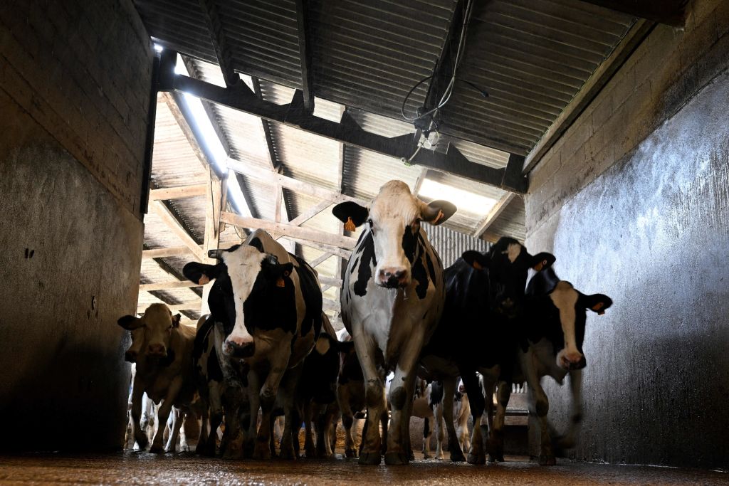 Las vacas caminan bajo aspersores de agua refrescante mientras se dirigen al ordeño en una granja (Damien Meyer / AFP vía Getty Images)Cae la explotación ganadera