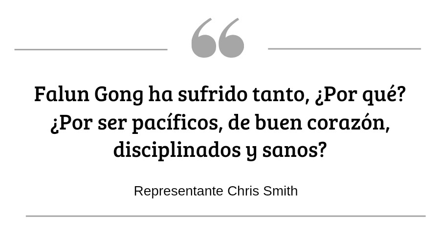 Dos meses antes de que su proyecto de ley fuera aprobado por la Cámara, el Sr. Smith estaba en el hospital por unas dolencias físicas, y las imágenes de la crueldad en curso en China se apoderó de él: un practicante de Falun Gong detenido o tal vez una víctima de otro grupo perseguido, presentado contra su voluntad.