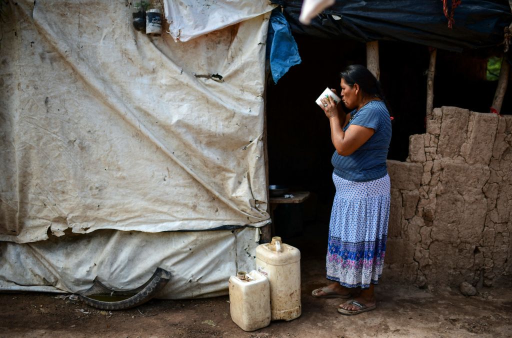 Una mujer wichi bebe agua servida de un recipiente de herbicida lleno de agua de un pozo en la comunidad indígena Misión Chaquena, cerca de Embarcación, provincia de Salta, Argentina, el 26 de febrero de 2020. En la húmeda pampa argentina, la soja crece gracias al buen clima, el suelo, pero se usan pesticidas y fertilizantes. Solo se recupera el 8 % de los envases vacíos de pesticidas y millones se desechan o reciclan ilegalmente. (Ronaldo Schemidt/AFP vía Getty Images)En algunos casos, dice el informe, los plaguicidas «se venden en bolsas de plástico, sin información de sus peligros» y causan «decenas de muertes infantiles por envenenamiento», como las reportadas desde septiembre a noviembre de 2024 en dos países de África.