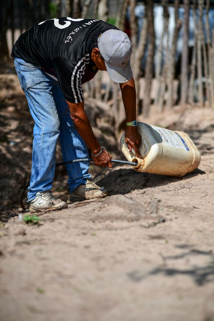 Un hombre llena un recipiente de herbicida con agua de un pozo en la comunidad indígena Misión Chaquena, cerca de Embarcación, provincia de Salta, Argentina, el 26 de febrero de 2020. En la húmeda pampa argentina, la soja crece gracias al buen clima, el suelo, pero se usan pesticidas y fertilizantes. Solo se recupera el 8 % de los envases vacíos de pesticidas y millones se desechan o reciclan ilegalmente. (Ronaldo Schemidt/AFP vía Getty Images)Muchos de los países compradores, según la organización, «carecen de la capacidad para gestionar los riesgos que entraña su uso».