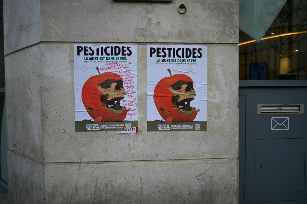 Carteles que muestran una manzana y denuncian los pesticidas en la agricultura, en París el 14 de febrero de 2025. (Magali Cohen / Hans Lucas vía AFPP vía Getty Images)Peticiones