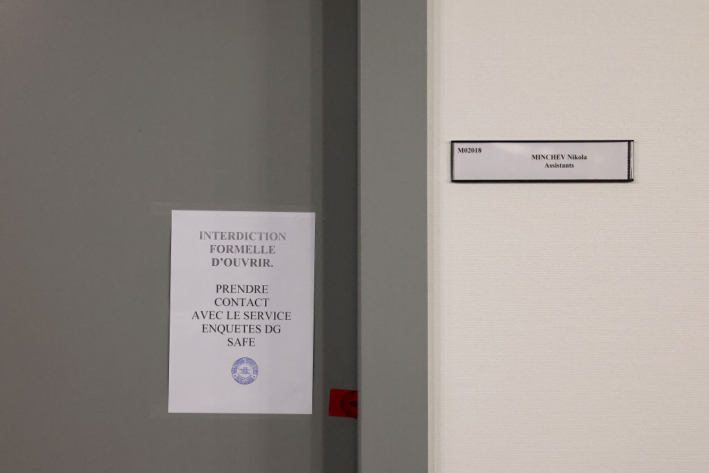 Esta fotografía muestra un precinto en la puerta de la oficina de asistentes del eurodiputado Fulvio Martusciello en el Parlamento Europeo en Estrasburgo, este de Francia, el 13 de marzo de 2025, mientras un nuevo escándalo de corrupción sacudía la organización. (Frederick Florin/ AFP vía Getty Images)El 13 de marzo, además del allanamiento, el juez ordenó precintar las oficinas de dos asistentes europarlamentarios en Bruselas.