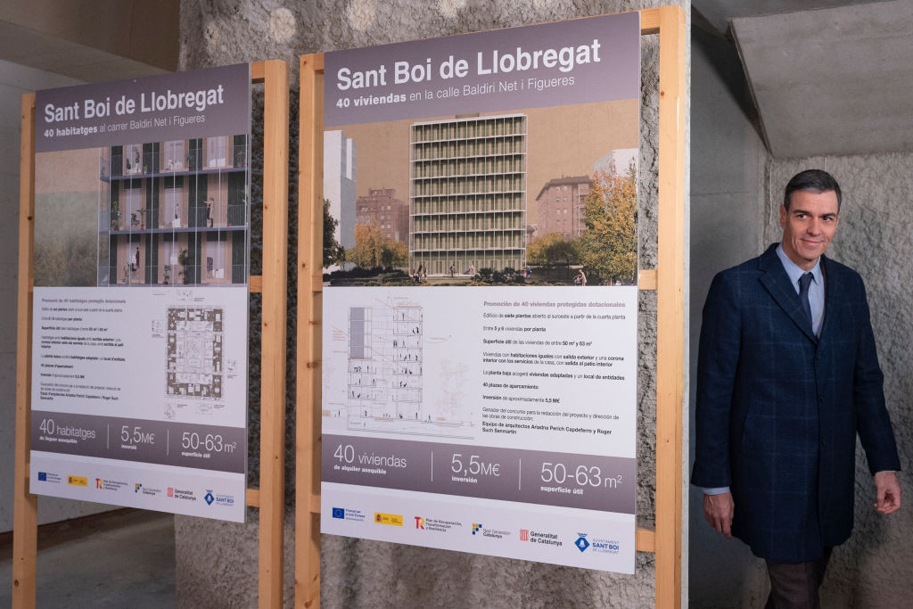 El presidente del Gobierno español, Pedro Sánchez, visita un complejo de viviendas sociales de alquiler asequible el 13 de febrero de 2025 en Sant Boi de Llobregat. (Josep Lago/ AFP vía Getty Images)Oferta del gobierno