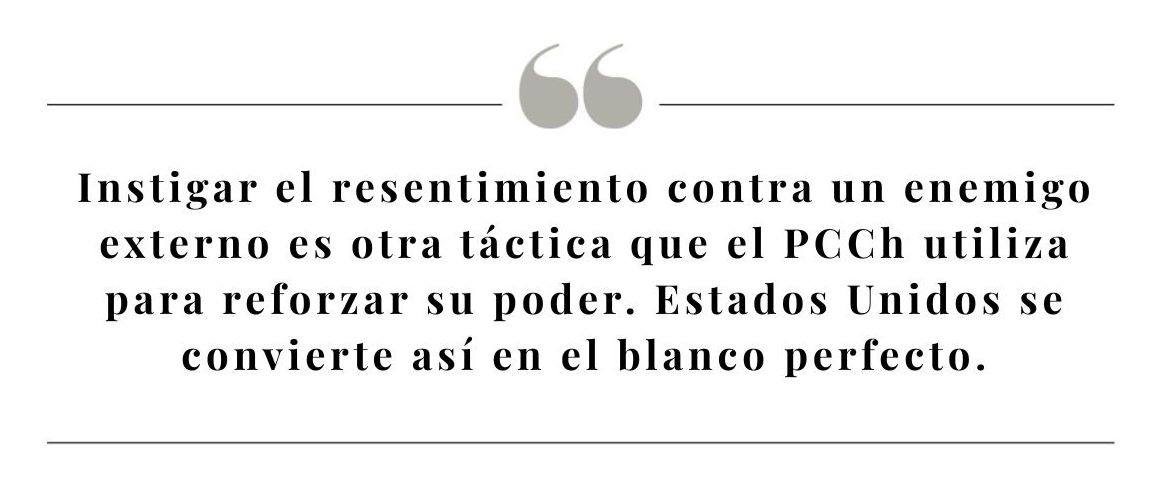 Instigar el resentimiento contra un enemigo externo es otra táctica que utiliza el PCCh para reforzar su poder. Así, Estados Unidos se convierte en el blanco perfecto, y el Partido puede difundir sus esfuerzos para contrarrestarlo.