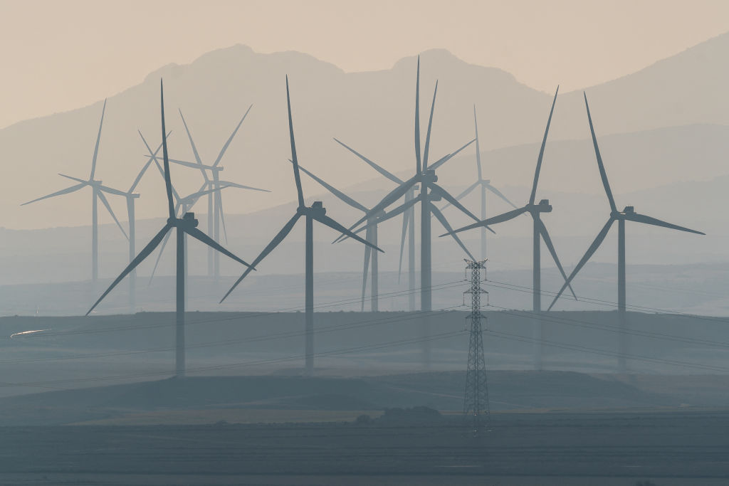 Esta fotografía tomada el 13 de febrero de 2023 muestra aerogeneradores en un parque eólico en Fuendejalón, con el monte Moncayo al fondo, provincia de Zaragoza, norte de España. (Cesar Manso/AFP a través de Getty Images)Impacto ambiental