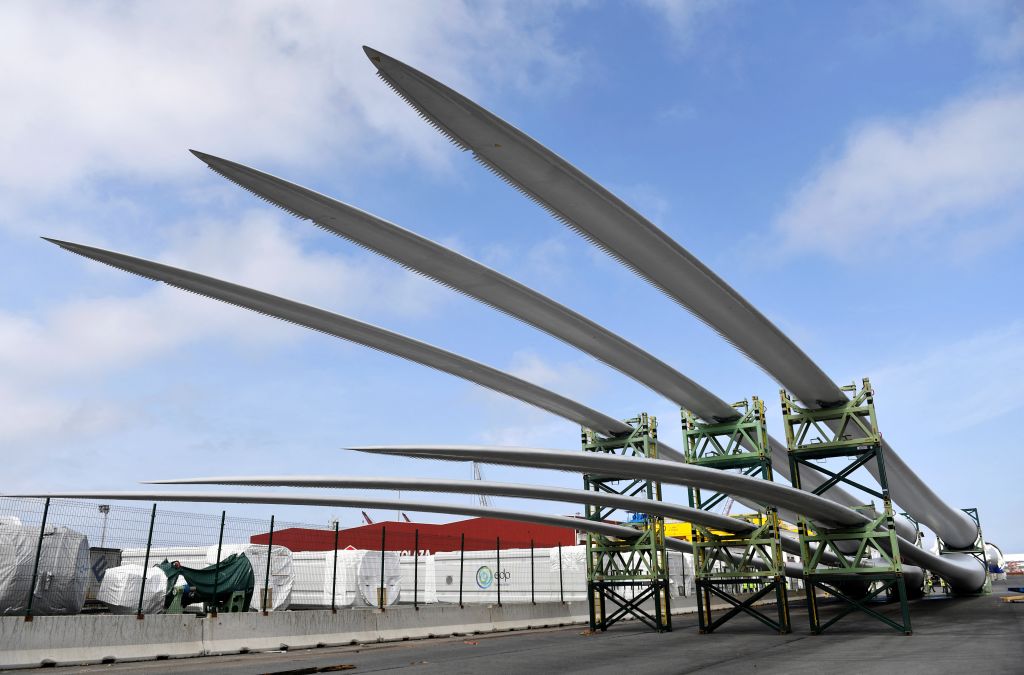 Esta fotografía tomada el 19 de marzo de 2024 muestra palas de aerogeneradores almacenadas en la empresa de logística Toro y Betolaza, que se encarga de los componentes de los aerogeneradores, en el puerto de Bilbao. (Foto de Ander Gillenea /AFP a través de Getty Images)En el marco estratégico de Energía y Clima, el gobierno español está apostando por una próxima generación de aerogeneradores eólicos marinos, sin embargo, estos no puede evitar el impacto ambiental.