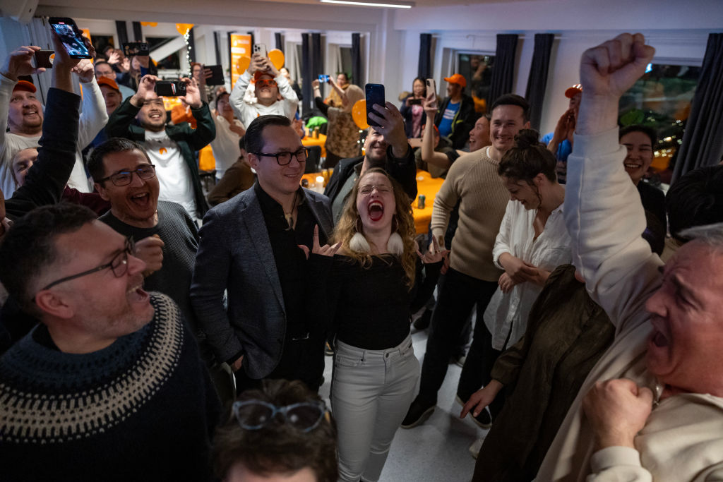 El presidente de Demokraatit, Jens-Frederik Nielsen (C), celebra durante su encuentro electoral en Nuuk, el 11 de marzo de 2025. Los demócratas de la oposición de centro-derecha han obtenido una victoria en las elecciones legislativas de Groenlandia, territorio danés, al triplicar con creces su apoyo hasta el 29,9 % de los votos, según mostraron los resultados oficiales el miércoles 12 de marzo.