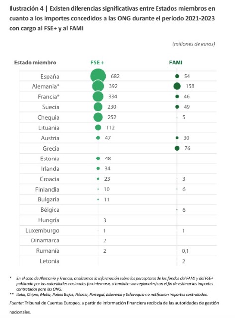 En cuanto a la metodología, la auditoría del TCE abarcó la financiación comprometida por la Comisión Europea durante el período 2021-2023, en el marco de las políticas internas (4 800 millones de euros), y la concedida por las autoridades de los Estados miembros en el marco del Fondo Social Europeo Plus (FSE+) y del Fondo de Asilo, Migración e Integración (FAMI) en régimen de gestión compartida (2 600 millones de euros), lo que supone un total de 7 400 millones de euros en subvenciones.